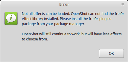 installasi hanya membutuhkan waktu singkat dengan hasil sukses, namun setelah aplikasi dicoba untuk digunakan ketika membukanya munculnya pesan error beruba text box dengan pesan “Not all effects can be loaded. OpenShot can not find the frei0r effect library installed. Please install the frei0r-plugins package from your package manager.” , untuk menghindar terjadinya ketidaksempurnaan, kami berusaha google yang mana didapatkan perlu tambahan installasi plugin sesuai pesan error yang disampaikan, yang mana perlu installasi frei0r-plugins dengan menjalanan command berikut;